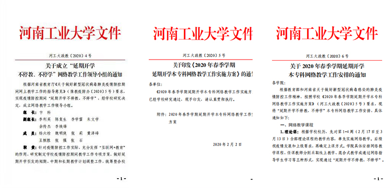面對新型冠狀病毒感染的肺炎疫情,河南工業大學高度重視,勇于擔當,認真貫徹落實習近平總書記關于疫情防控工作的重要指示精神和中央、省委決策部署,根據教育部《關于切實做好新型冠狀病毒感染的肺炎疫情防控工作應急預案的通知》、河南省教育廳《關于做好新型冠狀病毒肺炎疫情防控期間網上教學工作的指導意見》等精神,第一時間研究部署疫情防控,嚴格落實“十個堅決到位”,科學研判疫情形勢,發布延期開學通知,迅速啟動“延期開學不停教、不停學”預案,網絡教學工作扎實有序開展。