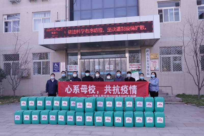 心系母校,共抗疫情。2月22日上午,河南工業大學生物工程學院2002級校友,鄭州安圖生物工程股份有限公司研發經理張中洲,河南堅久實業有限公司總經理劉勸平代表生物工程學院2002級全體本科校友專程回到母校,慷慨捐贈1000公斤高濃縮環境消毒液(次氯酸鈉溶液),為學校疫情防控加油助力。學校疫情防控工作領導小組副組長、副校長李煥鋒,學校防控辦副主任、黨辦主任朱立峰,校友辦、校醫院、后勤服務中心、生物工程學院等單位相關負責人參加了捐贈儀式。