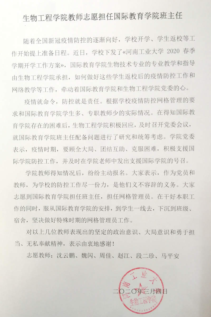 生物工程學院、糧油食品學院和管理學院的黨政領導得知國院情況后,當即表示予以全面配合。尤其是生物工程學院連夜召開了學院黨委會,統籌考慮本院需求和國院困難,秉著顧全大局積極支援的原則對教職工展開動員,以沈云鵬為代表的一批教工黨員迅速響應學院呼吁,紛紛表示,在干好本職工作的同時,服務國際教育學院的安排,到學生一線去,做好特殊時期的網格員。