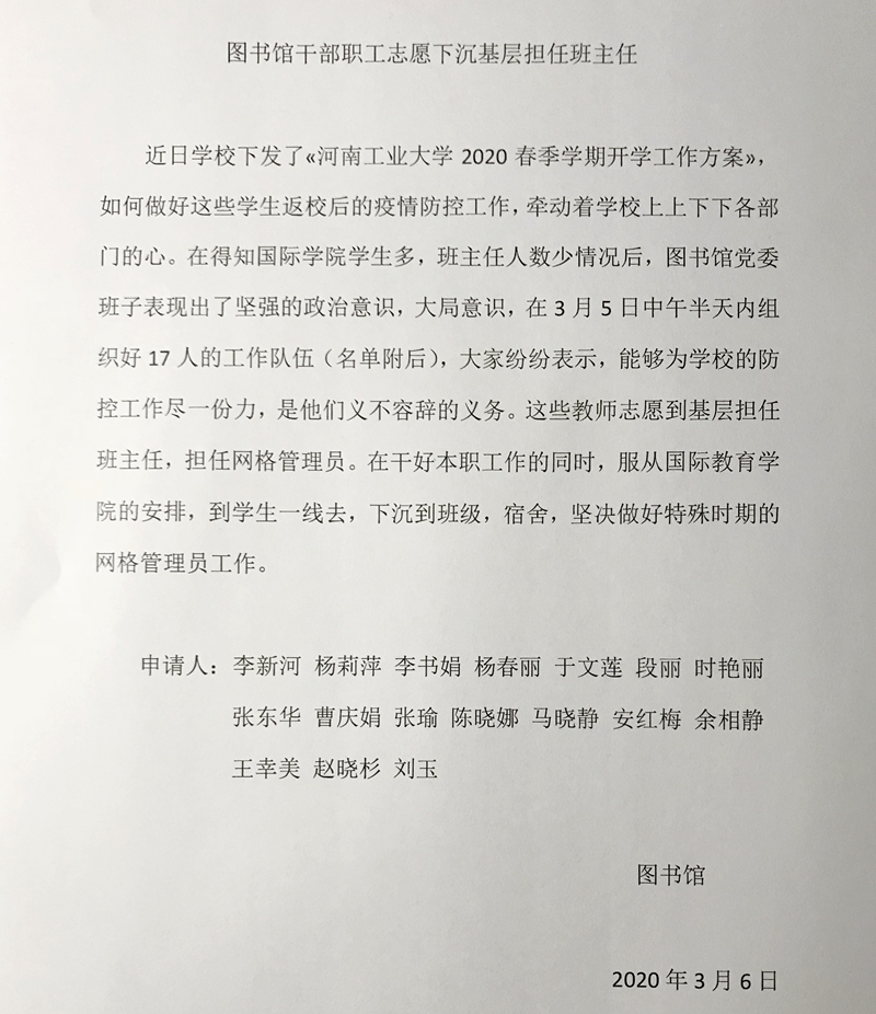 學生返校后的疫情防控工作牽動著學校上上下下各部門的心,直屬機構圖書館也向國際教育學院伸出援手。圖書館黨委班子向全館職工講形勢擺困難,教職工們表現出堅定的政治意識和大局意識,熱情高漲紛紛響應,短短時間就有17名教工加入國院網格員隊伍,協助學院做好構建疫情防控工作體系。