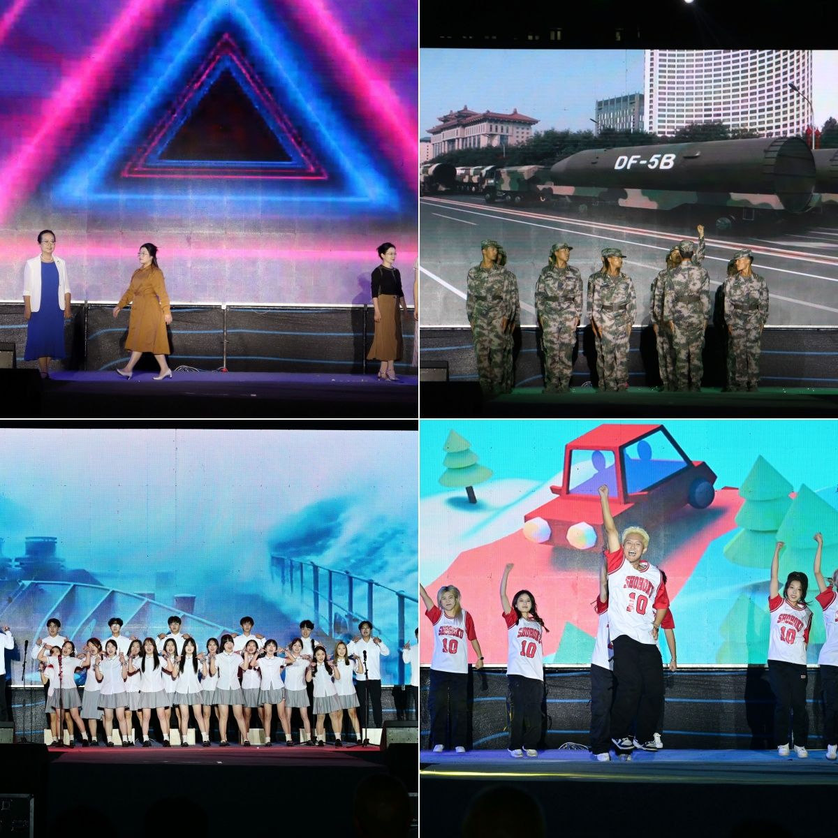 晚會共分為“踏浪前行·少年游”“風華正茂·耀青春”“宏圖泱泱·家國榮”三個篇章,涵蓋了舞蹈、朗誦、合唱、器樂合奏、舞臺劇、表演聯唱、走秀等多種藝術形式。晚會在燈光秀表演、22個學院(書院)旗幟的出場和樂隊《唯一》《你要跳舞嗎》中拉開序幕,精彩歌唱點燃了全場觀眾的熱情。離退休工作處夕陽紅合唱團帶來的《請你放心》《媽媽教我一支歌》用歌聲抒發對黨和國家的熱愛之情。民樂西洋合奏的《象王行》讓大家感受了中西方音樂世界的碰撞以及中華優秀傳統文化海納百川的包容性;歌曲串燒《青春四部曲》唱出了青春和夢想;街舞《破繭成蝶》《活力青春正當時》更是將現場氣氛推向頂端;舞臺劇《光陰的故事》帶領新生一起走進學校的課桌黑板、操場食堂來認識工大、熟悉工大、歸屬工大。走秀《教師天團》秀出了不一樣的教師風采。歌曲《不要怕》唱出了那血濃于水的民族情誼。優秀校友和在校學生共同朗誦的《等待》歌頌了鄧稼先等老一輩科研人員的無私奉獻精神和高尚品格;合唱《我們都是追夢人》唱出了青年勇于追夢、敢于追夢的決心;《時運》展現了古典舞的細膩柔美;國防預備役連的擒敵拳《戰士之舞》展現了鏗鏘有力的腳步和整齊劃一的口號和動作;朗誦《此間星火紅滿天》深情地表達了青年學子們對祖國的熱愛與忠誠;合唱《我宣誓》唱出了那份屬于青年的驕傲與榮光。