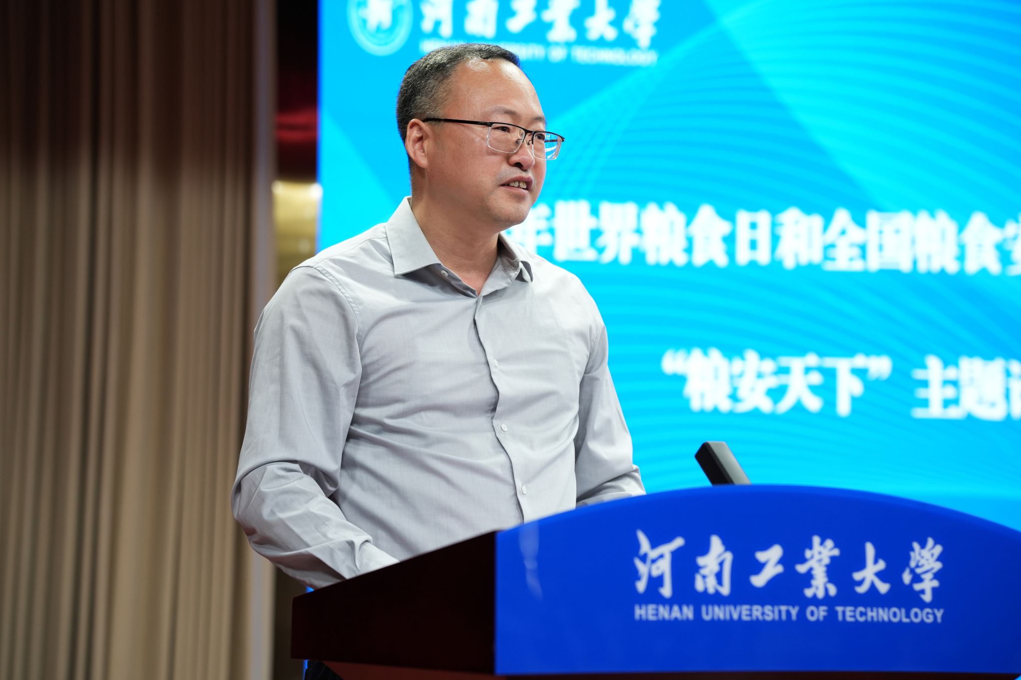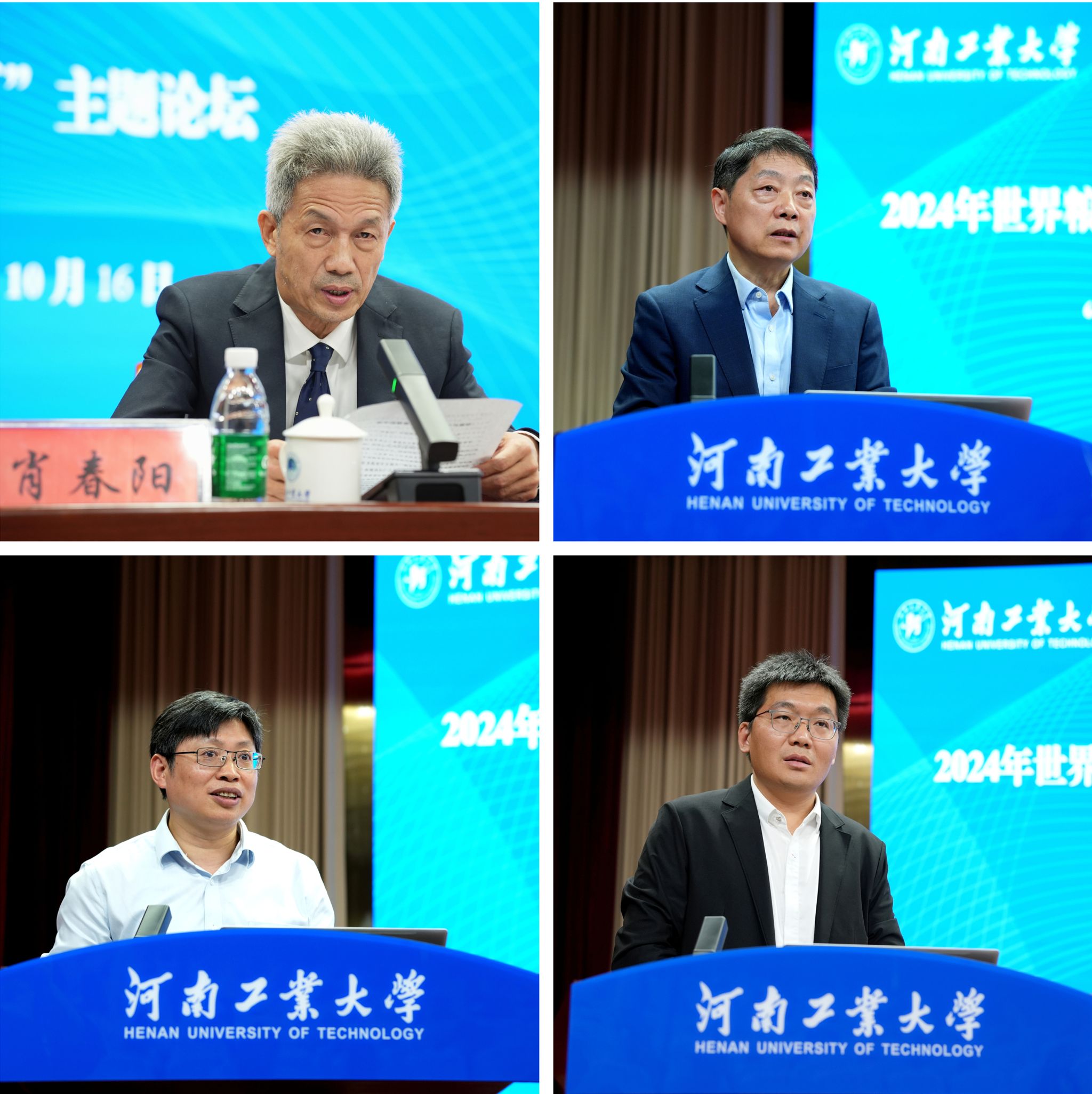 10月16日,2024年世界糧食日和全國糧食安全宣傳周活動暨建校70周年校慶工作啟動儀式在蓮花街校區學術報告中心D303報告廳舉行。全體在校校領導、各單位主要負責人、教師及學生代表參加會議。中國糧食經濟學會常務副會長肖春陽,河南金博士種業股份有限公司、河南道特爾醫藥科技股份有限公司董事長閆永生(校友),河南金博士種業股份有限公司物流總監韓喜玲(校友),武漢東昌倉貯技術有限公司董事長李翊瑋(校友),益海嘉里研發中心首席科學家徐學兵(校友),中國科學院天津工業生物技術研究所研究員王欽宏(校友),河南金博士種業股份有限公司總經理閆新垚(校友),河南省南街村(集團)有限公司副總經理李盤欣等應邀出席。校黨委副書記黃澤峰主持第一階段“建校70周年校慶工作啟動儀式”,副校長鄧淼磊主持第二階段“糧安天下”主題論壇。