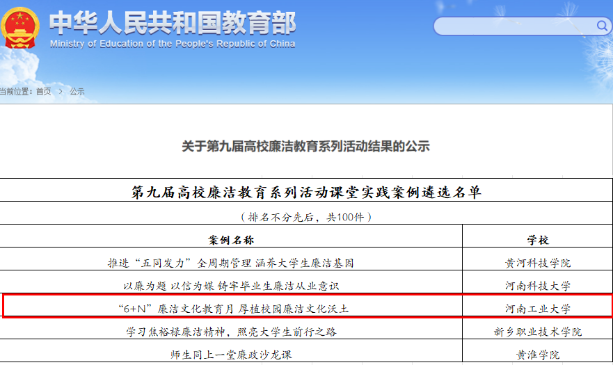 近日,教育部公布了第九屆高校廉潔教育系列活動評選結果,我校作品《“6+N”廉潔文化教育月 厚植校園廉潔文化沃土》入選全國100件課堂實踐案例優秀作品遴選名單,全省共入選五項。這次獲獎是我校被認定為河南首批清廉學校建設示范校后,在清廉學校建設方面取得的又一重要成果。