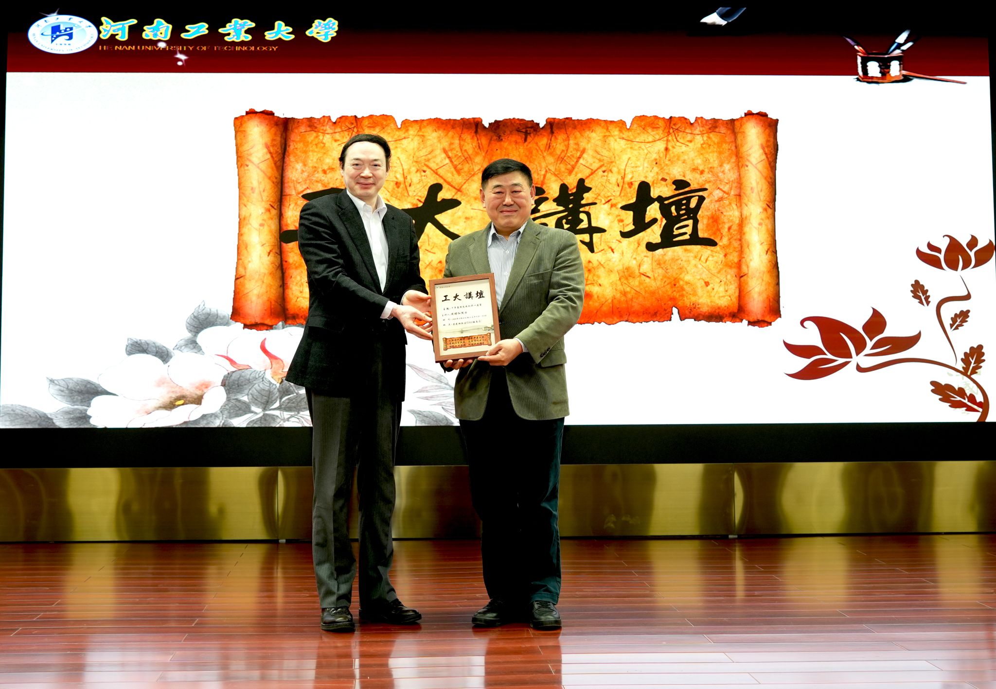 河南工業大學校長吳智深代表學校向周緒紅院士贈送工大講壇紀念證書,并與師生代表合影留念。