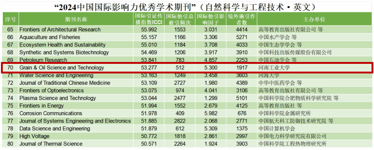 近日,《中國學術期刊國際引證年報》(2024版)正式發布。《糧油科技(英文)》(Grain & Oil Science and Technology)首次入選“2024中國國際影響力優秀學術期刊”(自然科學與工程技術●英文)。
