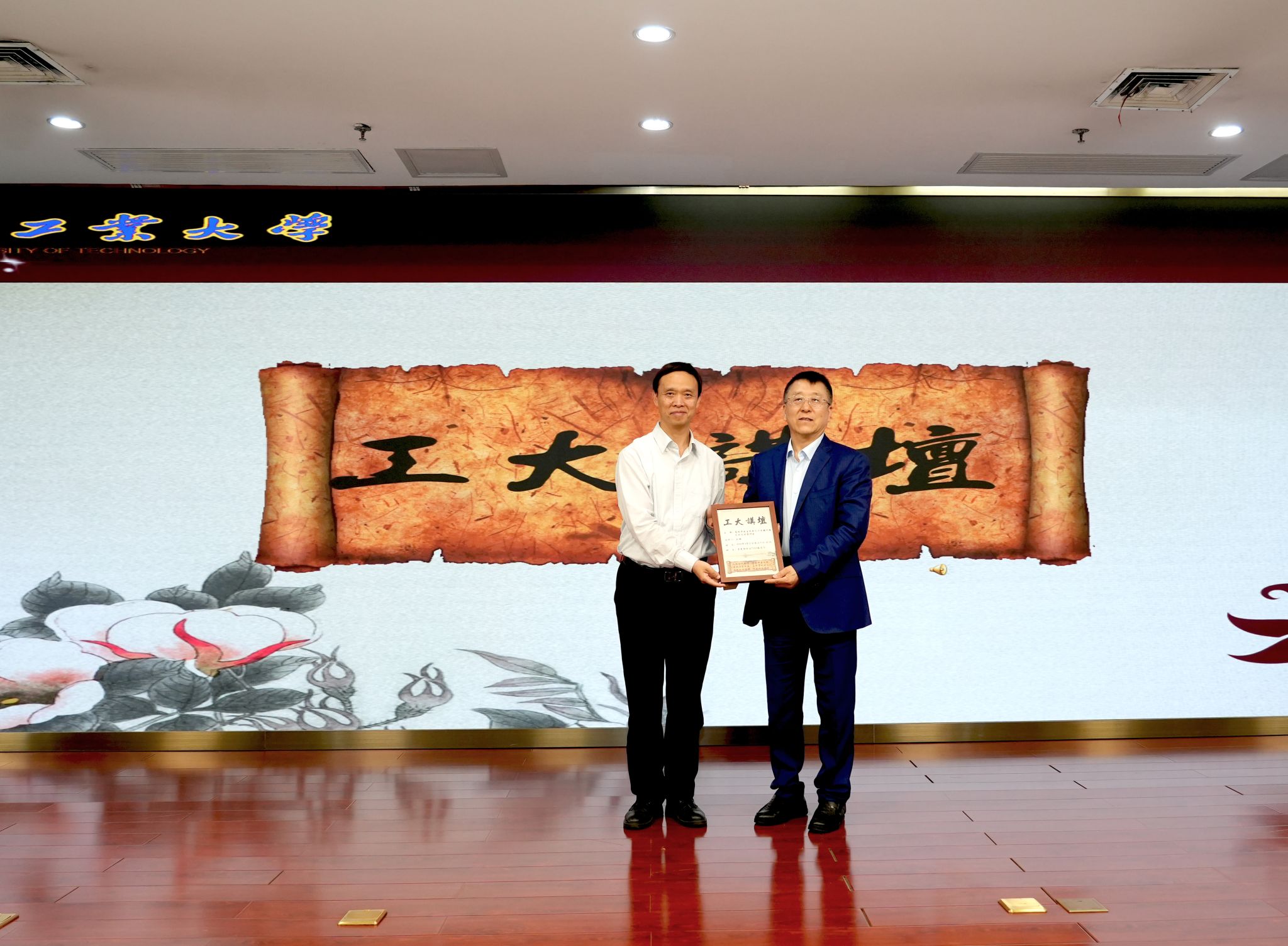 黃澤峰代表學(xué)校向劉鑄教授頒發(fā)工大講壇紀(jì)念海報(bào),并合影留念。