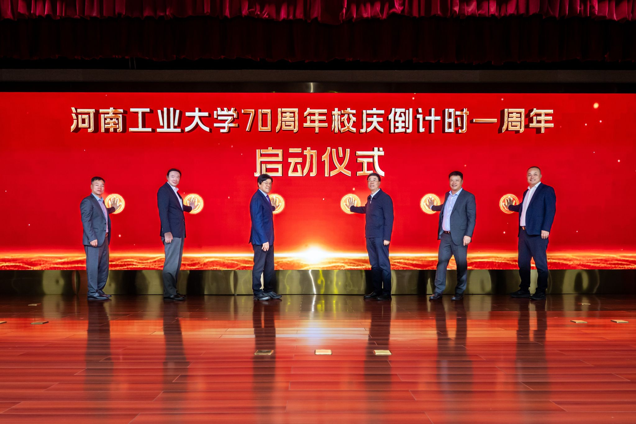 校領導、校友代表、合作企業代表共同按下70周年校慶一周年倒計時啟動手印,河南工業大學70周年校慶倒計時365天正式開啟。