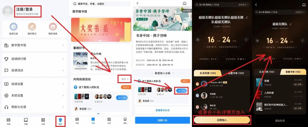 2. 在書(shū)城首頁(yè)找到組隊(duì)共讀活動(dòng)模塊,點(diǎn)擊進(jìn)入后即可選擇創(chuàng)建小隊(duì)或加入小隊(duì)。