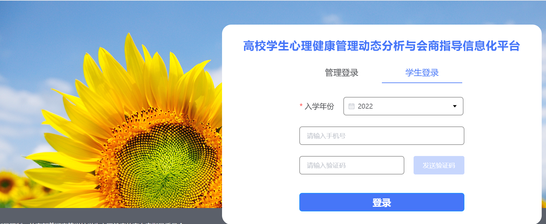 2.點擊“學生登錄”,選擇“入學年份2022”、輸入手機號,點擊“發送驗證碼”,輸入驗證碼后點擊“登錄”進入平臺。