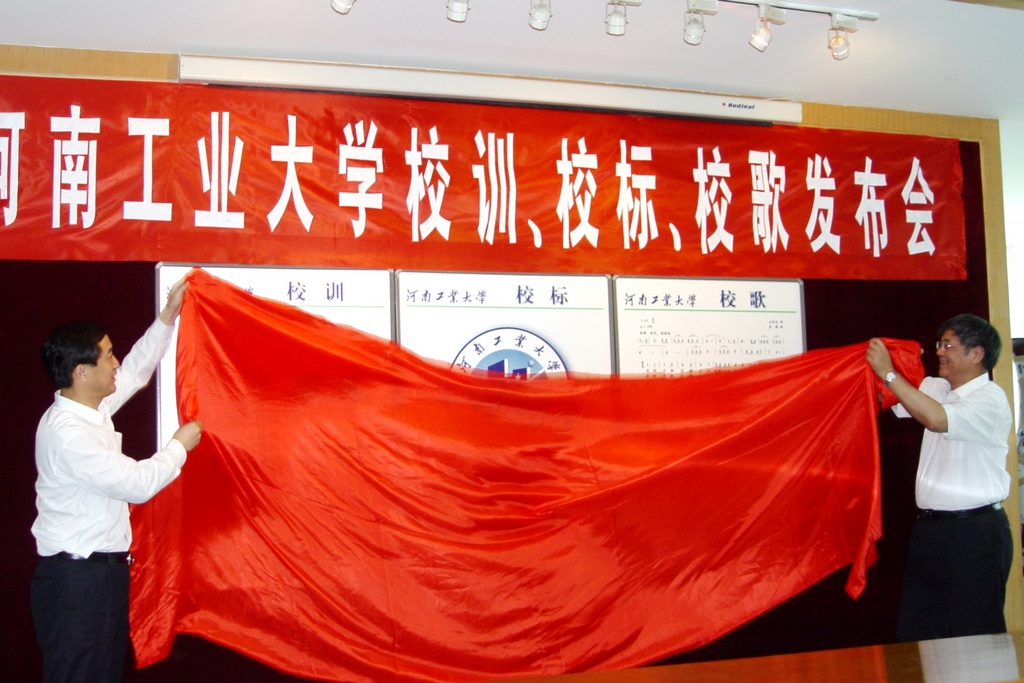 2006年6月9日對于全體河南工大人來說,是一個值得紀(jì)念的日子,河南工業(yè)大學(xué)的校訓(xùn)、校標(biāo)、校歌正式發(fā)布了。位于嵩山路校區(qū)的學(xué)校第三會議室里,校領(lǐng)導(dǎo)、離退休老干部代表、各單位負責(zé)同志、教師代表、學(xué)生代表、新聞媒體記者濟濟一堂,共同見證了這一莊嚴(yán)的時刻。黨委副書記何銳主持發(fā)布會。黨委副書記王玉斌介紹了校訓(xùn)、校標(biāo)、校歌的征集確定過程。作曲家吳歌先生代表創(chuàng)作者介紹校歌樂曲創(chuàng)作體會。黨委書記戚世鈞和校長董企銘共同為校訓(xùn)、校標(biāo)、校歌揭幕。教師代表張同斌和學(xué)生代表楊州分別發(fā)表了見證感言。揭幕那一刻,就像是為校訓(xùn)、校標(biāo)、校歌揭開了紅蓋頭,也像是為河南工業(yè)大學(xué)翻開新的一頁。
