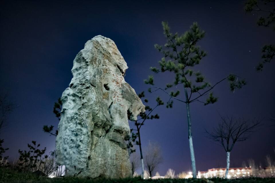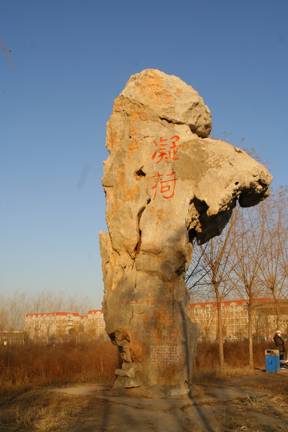 校園蓮湖西南端,立著一尊灰色巨石,松柏伴配,上刻“凝荷”二字,油漆涂紅,醒人眼目。這石來自江蘇,是那里的校友為學校50年校慶所贈。學校黨委常務副書記王玉斌、原副校長翟俊仁曾為它揭過紅蓋頭,200多名師生也曾為它的落座圍觀喝彩,留下了不凡而永久的紀念。