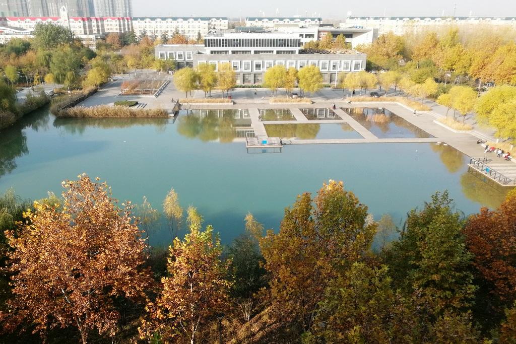 蓮景比不過曲岸的湖面大,卻為湖面添加了俏麗。蓮水相依,仿佛目不交睫地傳情。湖面碧波蕩漾,明靜另帶柔爽,讓你“近水樓臺先得月”。一湖之隔,辦公教學區在前,學生宿舍群在后,水上金橋成了求知者的必經之路,聯通著成功的彼岸。自然的,蓮湖和育人成龍有了情結,河南工大人的設計伏筆露了真跡。