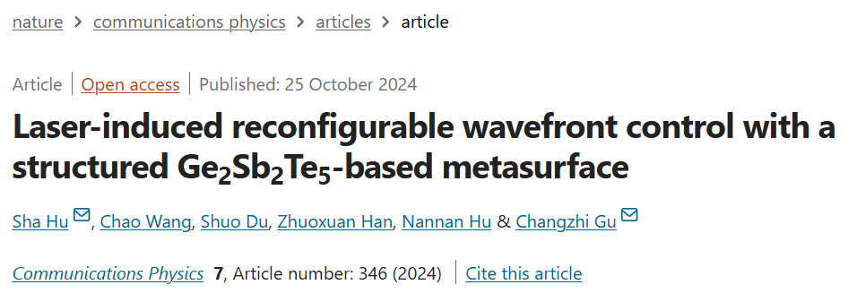 近日,我校物理學院青年教師胡莎博士在Nature旗下權(quán)威物理期刊《Communications Physics》(中科院一區(qū)TOP)上發(fā)表了題為“Laser-induced reconfigurable wavefront control with a structured Ge2Sb2Te5-based metasurface”(DOI: 10.1038/s42005-024-01846-9)的研究型論文。胡莎博士為論文的第一作者和第一通訊作者,中科院物理所顧長志研究員為共同通訊作者,河南工業(yè)大學為第一署名單位和通訊單位。