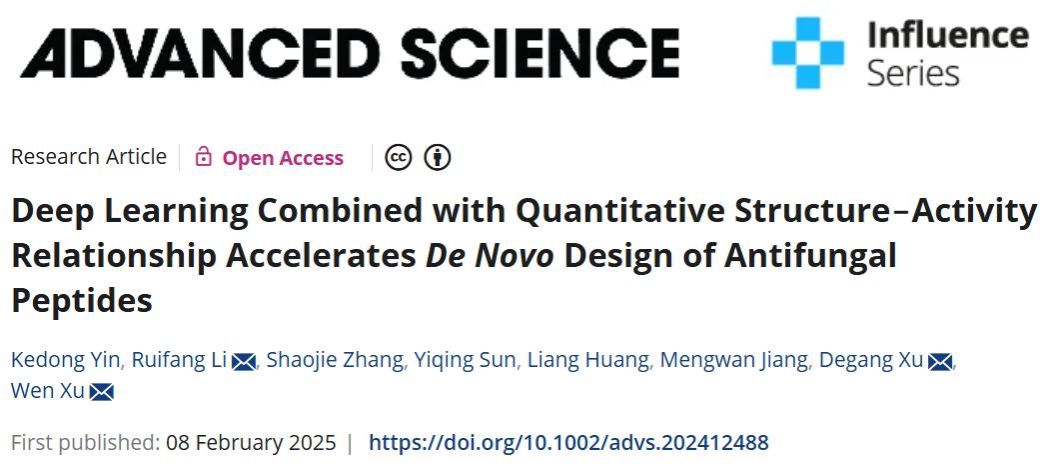 近日,我校生物工程學院李瑞芳教授團隊在國際頂級跨學科學術期刊《Advanced Science》(中科院一區TOP,IF=14.3)上發表了題為“Deep Learning Combined with Quantitative Structure?Activity Relationship Accelerates De Novo Design of Antifungal Peptides”(DOI: 10.1002/advs.202412488)的研究論文。碩士研究生尹柯棟為第一作者,李瑞芳教授為第一通訊作者,河南工業大學為唯一署名單位和通訊單位。