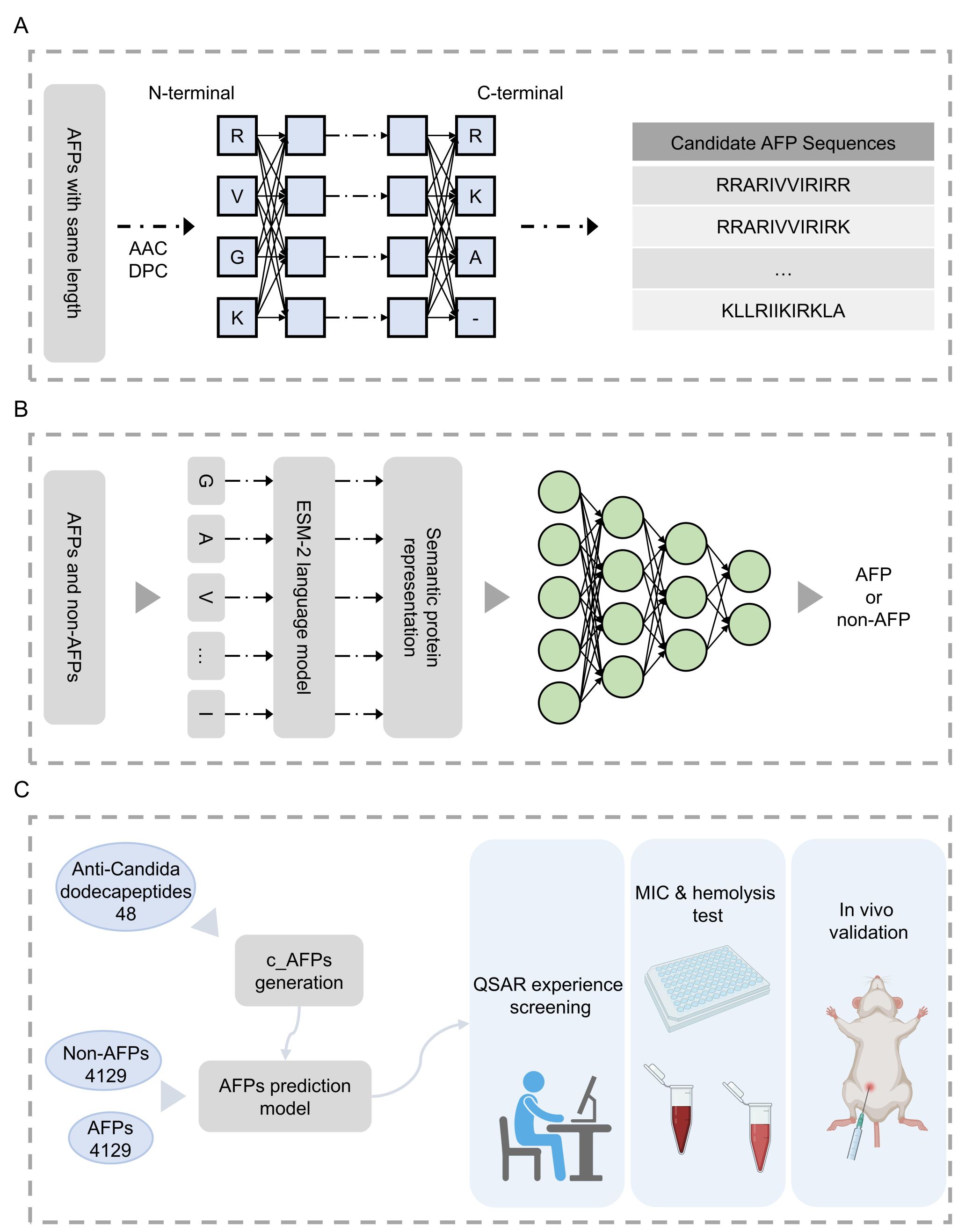 念珠菌感染亟需新型抗真菌藥物,傳統藥物易產生耐藥性。抗真菌肽(AFP)憑借獨特作用機制成為理想候選,但傳統篩選方法效率低下。基于此,李瑞芳教授團隊創新性地開發了一種基于深度學習和定量構效關系經驗篩選的AFP從頭設計方法DL-QSARES。該方法通過重組優勢氨基酸和二肽組成生成候選AFP (c_AFP),并利用自然語言處理模型和基于物理化學性質的QSAR方法進行高效篩選,最終獲得49個對白色念珠菌具有顯著抑制活性的c_AFP,其中4個最優的c_AFP對多種病原真菌的MIC均小于10 μg/mL,AFP-13在動物模型中表現出優異的體內治療效果。這項研究為抗真菌藥物研發提供了全新的智能化設計范式,顯著加速了AFP的發現進程,為解決耐藥性難題開辟了新途徑。