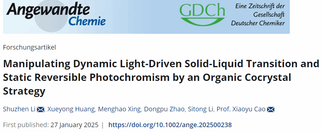 近日,我校化學(xué)化工學(xué)院青年教師李樹珍博士在國際頂級學(xué)術(shù)期刊《Angewandte Chemie International Edition》(影響因子IF = 16.1)發(fā)表題為 “Manipulating Dynamic Light-Driven Solid-Liquid Transition and Static Reversible Photochromism by an Organic Cocrystal Strategy” (DOI: 10.1002/anie.202500238)的研究性論文。李樹珍博士為該論文的第一作者,碩士研究生黃雪勇為第二作者,其博士后合作導(dǎo)師曹曉雨教授為通訊作者,河南工業(yè)大學(xué)為唯一署名和通訊單位。