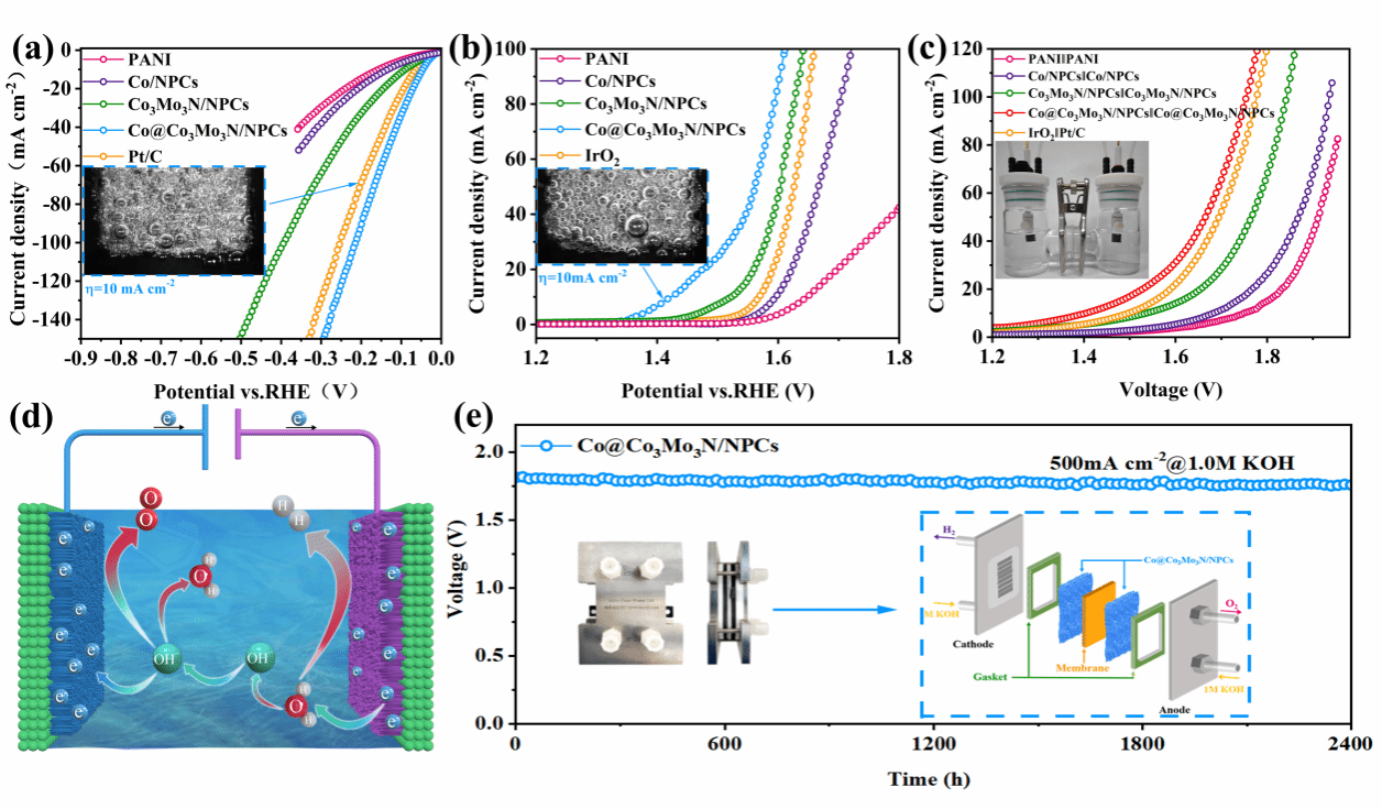 得益于這些先進結構特性,優化后的Co@Co3Mo3N/NPCs電催化劑在10 mA cm-2電流密度下僅表現出37 mV(HER)和203 mV(OER)的超低過電位。實驗還表明,采用該催化劑的H型電解槽在1.41 V電壓下即可實現10 mA cm-2電流密度,并在200小時連續運行中保持優異穩定性。進一步地,將該催化劑組裝至零間隙堿性電解槽中用于全水解時,在500 mA cm-2電流密度下僅需1.80 V電壓,且展現出超過2400小時的超長使用壽命。
