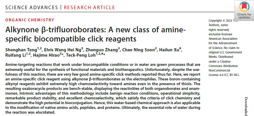 近日,前沿交叉科學(xué)與技術(shù)學(xué)院(CAIST)羅德平院士團(tuán)隊(duì)及合作機(jī)構(gòu)的研究人員在無金屬“點(diǎn)擊”技術(shù)方面取得了突破性進(jìn)展,這種胺特異性且高生物兼容性的方法,將可能應(yīng)用于化學(xué)生物學(xué)與生物醫(yī)藥等領(lǐng)域。該成果在Science子刊《Science Advances》雜志上發(fā)表:“Alkynone β-trifluoroborates: A new class of aminespecific biocompatible click reagents”(DOI: 10.1126/sciadv.adg4924)。羅德平院士為論文通訊作者,河南工業(yè)大學(xué)為論文的第一署名單位。
