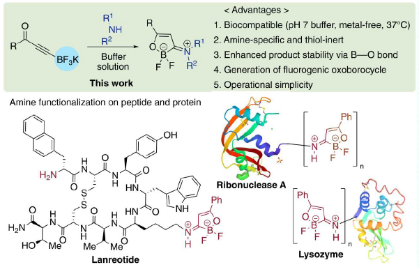 研究團(tuán)隊(duì)開發(fā)了一種炔酮β-三氟硼酸鹽作為胺特異性“點(diǎn)擊化學(xué)”試劑,并應(yīng)用于1,4-共軛加成反應(yīng)中。該方法具有高化學(xué)選擇性且產(chǎn)物穩(wěn)定等特點(diǎn),通過官能團(tuán)配位穩(wěn)定有效抑制了副反應(yīng)的發(fā)生,解決了其它方法的局限性。